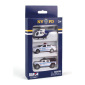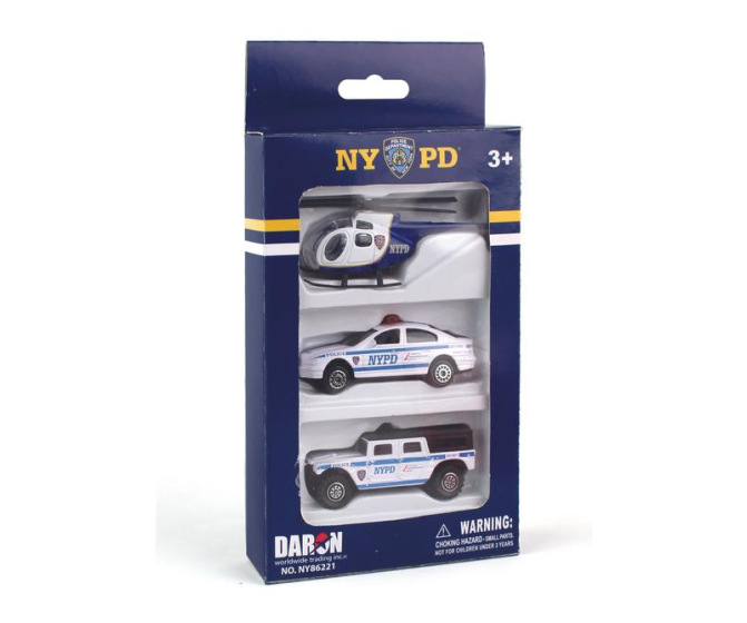 Set of three die cast metal NYPD vehicles includes a helicopter, a police car, and a humvee. Realistic details, and wheels that roll. 1/64th scale.