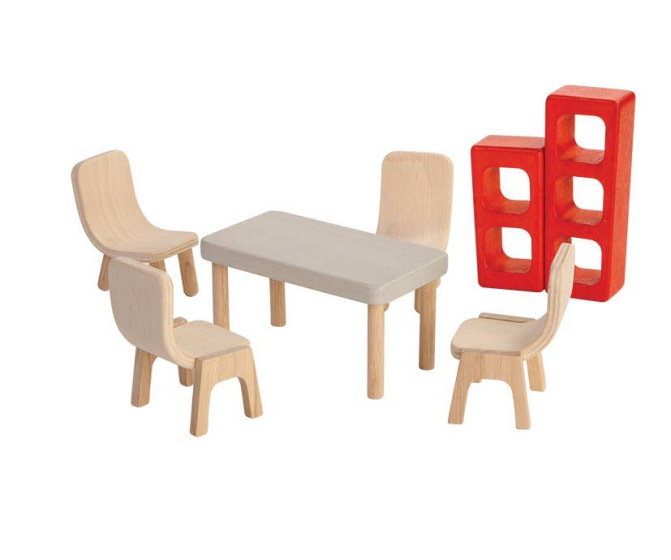 The PlanToys Dining Room is a great set for sprucing up a dollhouse and encouraging creative play. Standard sized furniture fits most dollhouses. Made sustainably in Thailand with rubberwood, the PlanToys Dining Room includes a table, four chairs, and two cupboards.