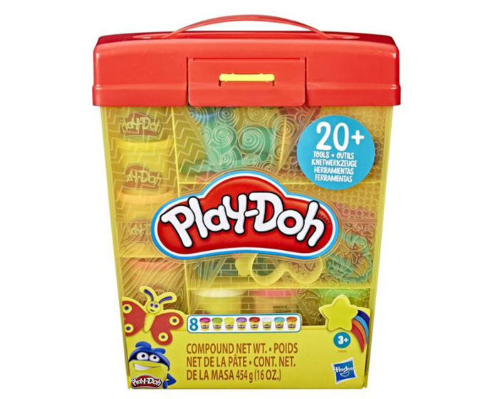 This 20 piece Play-Doh playset includes 8 different colors of Play-Doh, 12 dough tools, and a plastic carrying tub for keeping it all together.