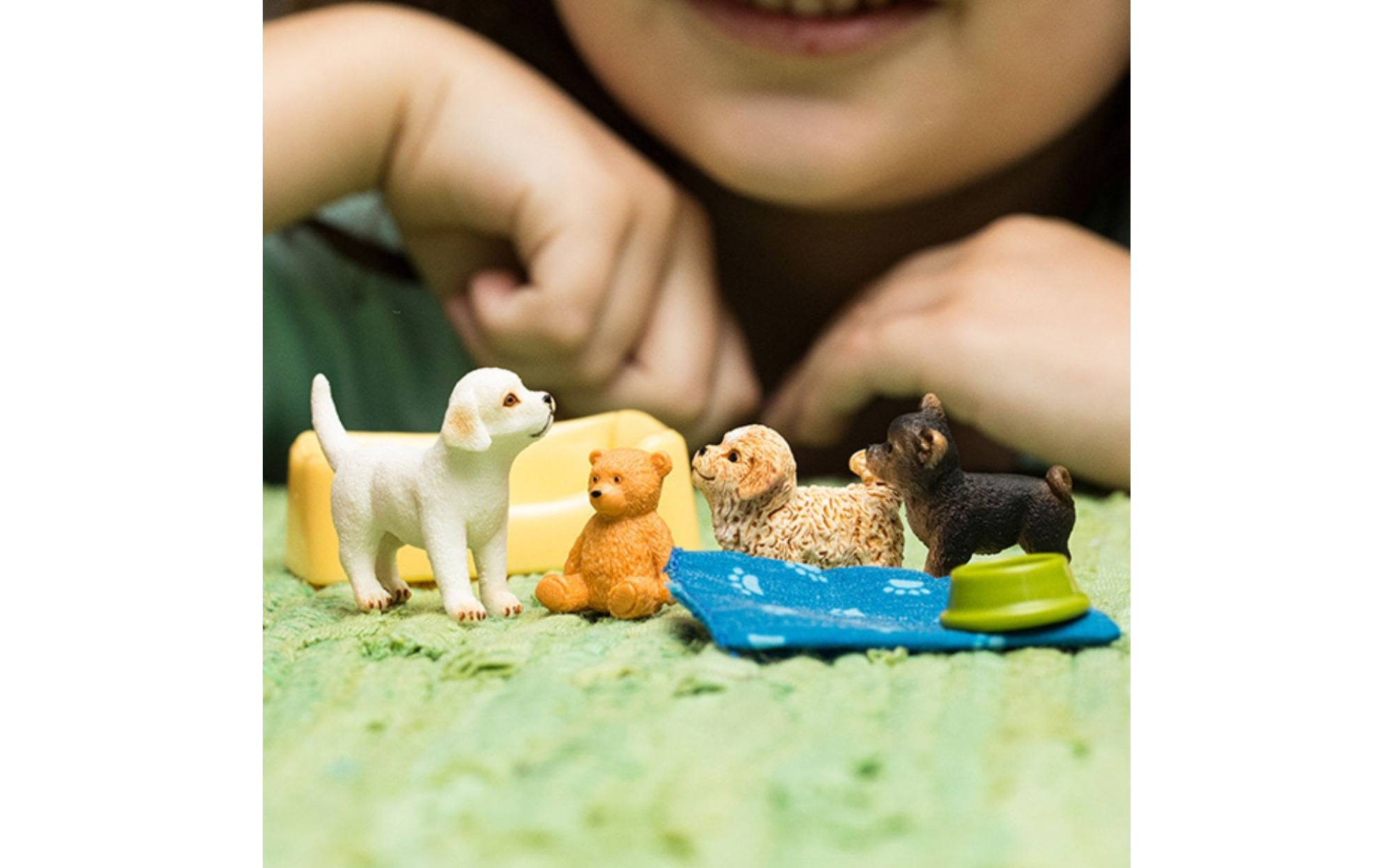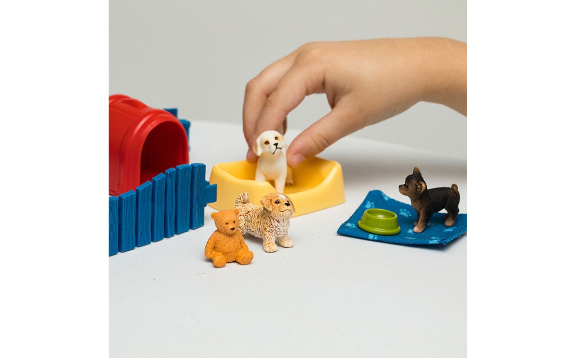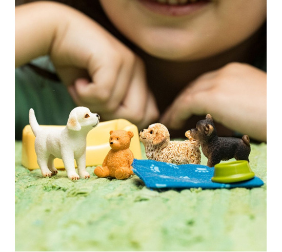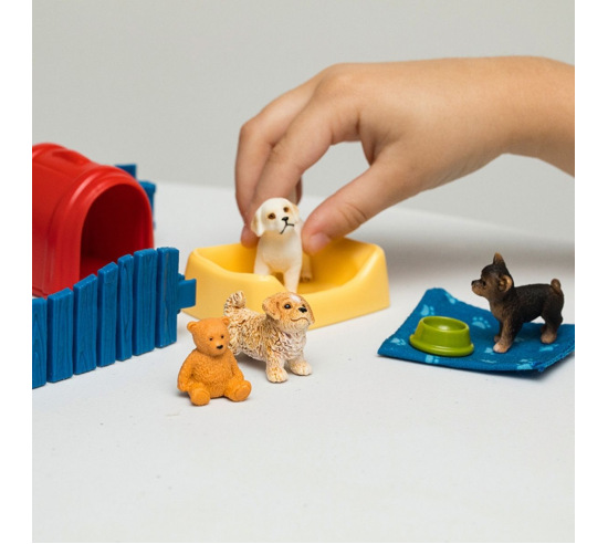 Great for sand tray or use it as a play set. A Maltipoo, a Chihuahua and a Labrador Retriever play together in the puppy pen. What a wild time the three of them are having! They romp around on the cuddly blanket, compete for the teddy bear and play hide-and-seek. In between, they take a well-deserved nap in the dog basket.