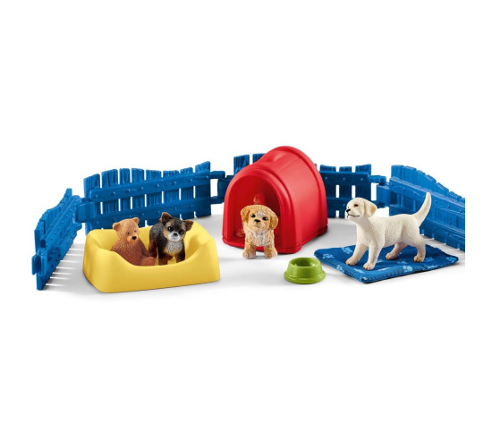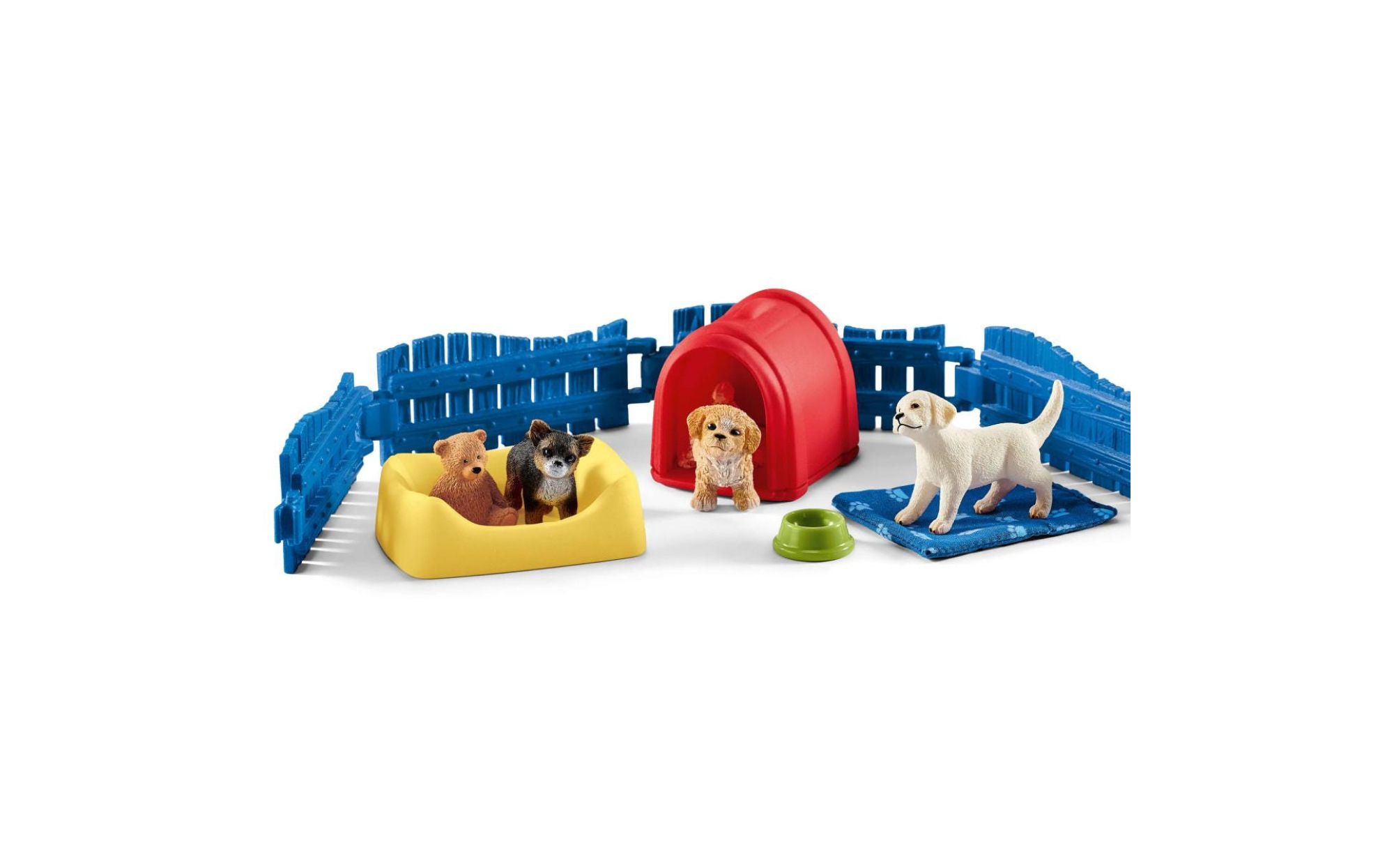 1x Maltipoo puppy, 1x Chihuahua puppy, 1x Labrador Retriever puppy, 1x dog house, 1x dog basket, 1x blanket, 1x bowl, 1x teddy bear, 5x fence