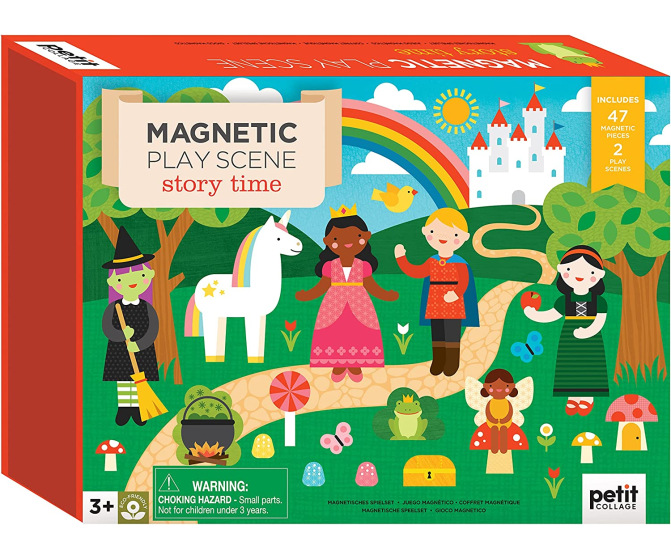 The Storytime Magnetic Scene from Petit Collage allows children to express their creativity and use their imagination as they decorate an animal treehouse scene or create a super cute animal picnic in the park. Includes two scenes and 47 magnetic pieces in one storage box.
