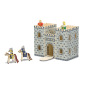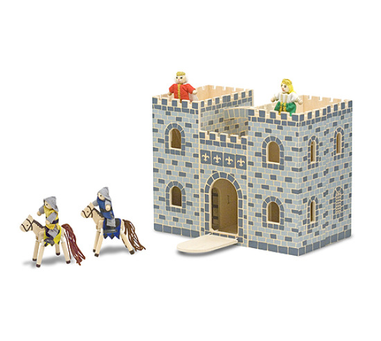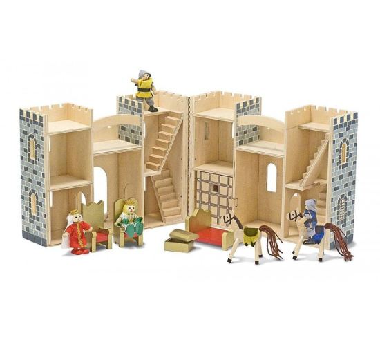 A high quality wooden castle that opens with a working drawbridge and dungeon. Includes: a king, queen, two knights, two horses, thrones, a bed, and treasure chest. Small enough to carry, big enough to enjoy. Comes completely assembled, ready to go! Castle weighs 4 1/2 pounds and has a handle for portability. If you're limited on space or traveling, this castle is perfect.