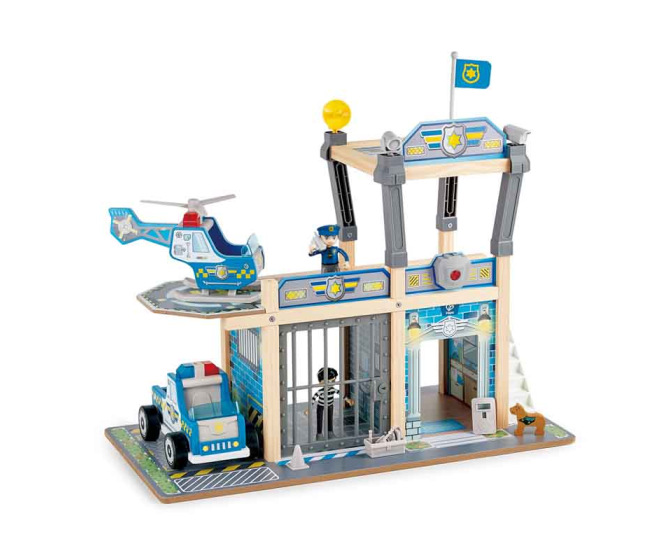 Tell your own story of cops and robbers with this fantastic police station playset. The two-level station features a jail cell with opening door, an office, a helicopter with its own landing pad, a police car with parking space, one police officer, one prisoner and loads of police equipment accessories - even a police dog. 23" tall fully assembled.