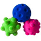 Set of three textured tactile balls in bright colors and shapes are soft and fuzzy. We love the feel of these stress balls and the varying resistance of each ball. Includes three 2.5" diameter balls in a gift box. Pink, blue and green. Made from natural rubber foam.