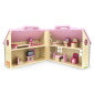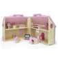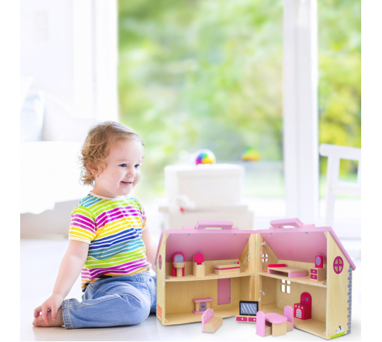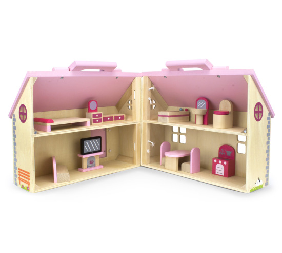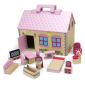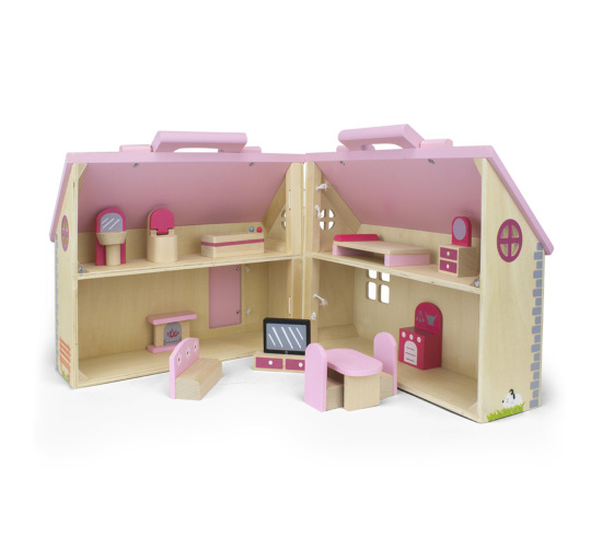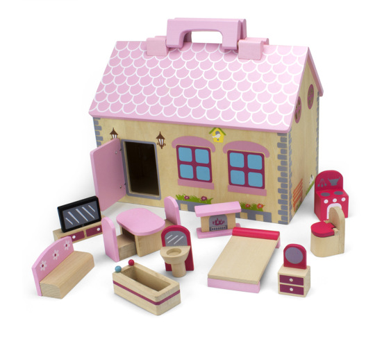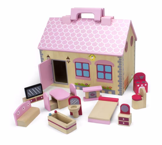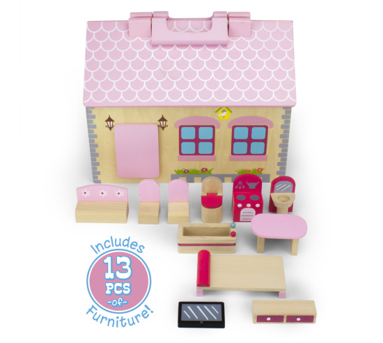 Pick Up and Go! This craft cottage redefines what it means to be a "mobile" home! Pack up your furniture and dolls, grab the handy handle, and the Take-Along Country Cottage is ready to go. The cottage's exterior is rustic and cozy, with a quaint garden, picture windows, and a birdhouse. Inside, there are four rooms to decorate with thirteen pieces of sweet, pink furniture cut from natural wood and finished with safe, water-based paint.