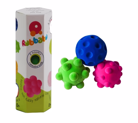 Set of three textured tactile balls in bright colors and shapes are soft and fuzzy. We love the feel of these stress balls and the varying resistance of each ball. Includes three 2.5" diameter balls in a gift box. Pink, blue and green. Made from natural rubber foam.